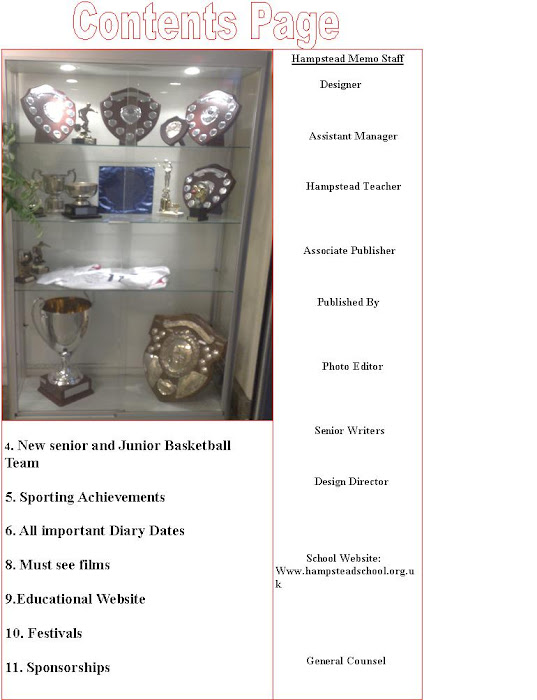 During my lesson I showed my current work to the class and got feedback on the good points and bad points of the Front Cover. During the process of this conversation I understood that the picture shows a lot about the school as well as its achievements over the years. The font and title of the school was another good point as well including the key conventions I followed. The improvements that I understood was the bottom of the front page, the idea of the heading and the sub-headiong having the same style of font didn't work to well, so for further improvements I need to look at how I can change that and make it more exclusive. In general the front cover was good, however I need to work on the bottom section of the page, making the content information more alive and conventional instead of make it look plain and simple.